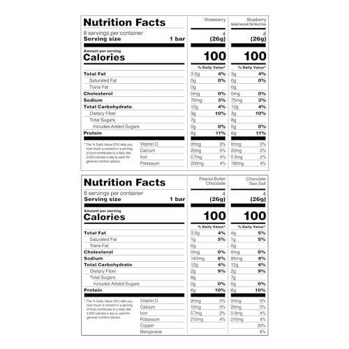 Mini protein bars made with simple ingredients; Includes Chocolate Sea Salt, Peanut Butter Chocolate, Blueberry, and Strawberry