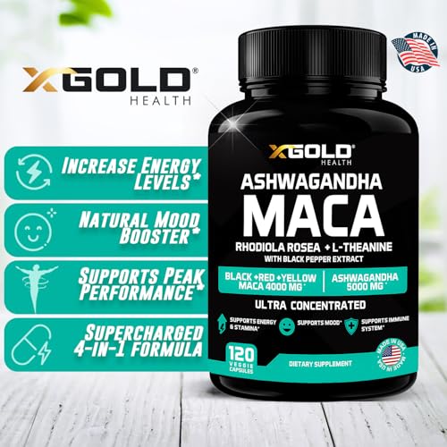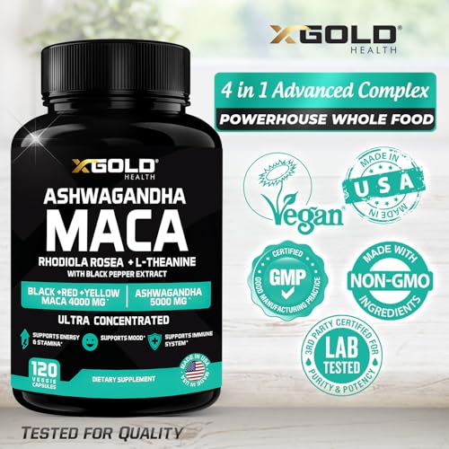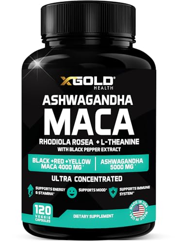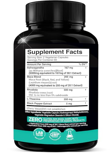 Ashwagandha 5,000mg + Maca Root Black, Red, Yellow 4,000mg, Rhodiola & L-Theanine: 30:1 Extract Ashwagandha Capsules, 20:1 Extract Maca Root Capsules – Supplement for Men and Women