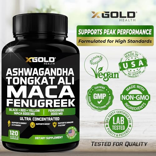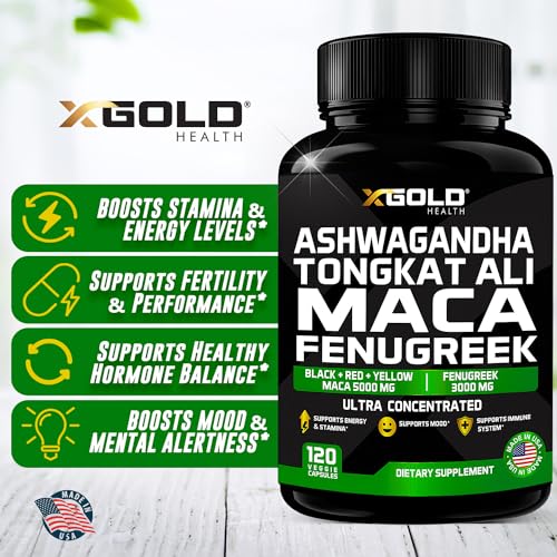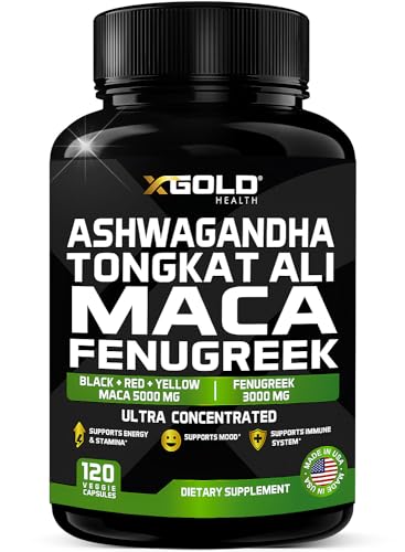 Ashwagandha 5000mg + Tongkat Ali 1000mg + Maca Root 5000mg + Fenugreek 3000mg Supplement | Black + Red + Yellow Maca Root Extract & Fenugreek Herbal Supplements for Men & Women – Made in USA
