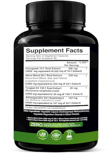 ADVANCED HERBAL FORMULA: Strive for greatness by supplementing your diet with our powerful herbal complex! Formulated with an ultra-concentrated, highly micronized blend featuring of 5000mg ashwagandha at a 30:1 extract, 1000mg Tongkat Ali at a 50:1 extract ratio, 5000mg maca at a 20:1 extract ratio, and 3000mg fenugreek at a 10:1 extract ratio, this supplement packs a potent punch for greater bioavailability and effects you can feel!
