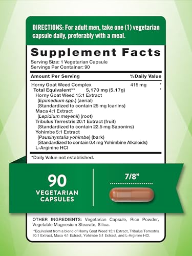These vegetarian capsules provide herbal support for men. Each serving delivers 415 mg of a Horny Goat Weed complex, which consists of Horny Goat Weed Extract, Maca Extract, Tribulus Terrestris Extract, Yohimbe Extract, and L-Arginine HCl.