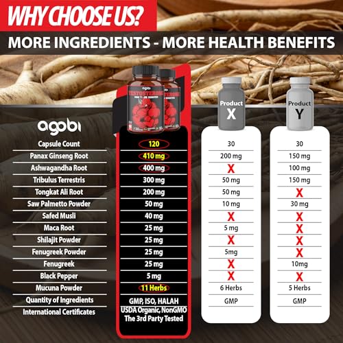 Superior Strength: Agobi capsules equivalent to 14000 mg per Serving Size of all ingredients. Specially, our Ginseng, Ashwagandha, Tribulus are 10:1 Concentrated, more than 5:1 from others. Support always “On” status.
