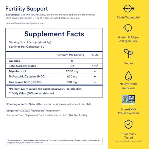 MADE TRACEABLE: with Ubiqsome CoQ10 (2.7x more bioavailable than standard CoQ10 and is produced at a facility using 67% renewable energy sources) from Settala, Italy, NAC (N-Acetylcysteine) from E’ Zhou City, China, and Myo-Inositol from Cangzhou City, China. Final Place of Manufacturing