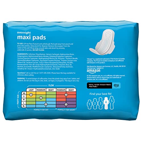 Amazon Basics Maxi Pads with Flexi-Wings, Overnight Absorbency, Size 4, are designed to provide a new level of skin health and protection through their Dri-Fit technology. The cotton enhanced and breathable outer layers wick away moisture 2x faster to help your skin stay dry and comfortable. The super absorbent core provides up to 10 hours of leakage protection. You can identify your best fit through the sizing chart to help prevent leaks and get the ultimate coverage.