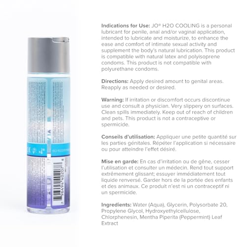 REFRESHING COOLING SENSATION: JO H2O Cooling has the performance of our most popular water-based lubricant, but with the added benefit of a refreshing cooling sensation that enhances all types of intimate experiences. Its sensual, comforting glide and silky-smooth feel are perfect for any intimate moment.
