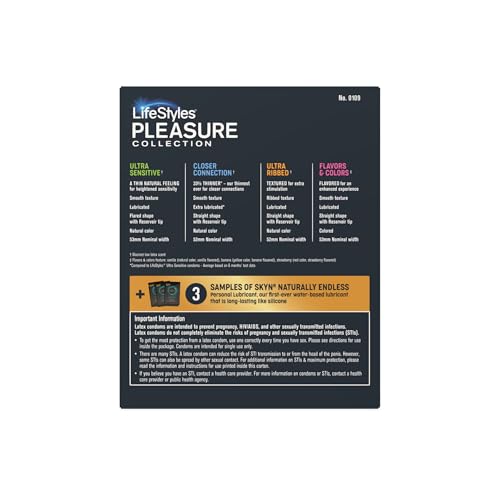 We’ve been leaders and innovators in the sexual wellness business for over 100 years, so we know a thing or two about pleasure. The LifeStyles Pleasure Collection allows you to keep each experience fun and unique while enjoying the trusted protection we’re known for. This assorted pack with a new mix comes with four of our favorites: Ultra Sensitive,Closer Connection, Ultra Ribbed and Flavors and Colors. Now, the path to pleasure is in your hands — choose whichever style suits the mood and enjoy with confidence.