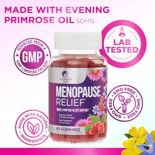 MENOPAUSE SUPPLEMENTS FOR WOMEN: Nature’s Glow Natural balance support supplement gummies with complete multi menapause relief vitamins mild hot flashes night sweats with no soy isoflavones black cohosh dim pills and tablets pre menopausal perimenopause premenopausal energy hot flash inner glow support happy la menopausia para mujer