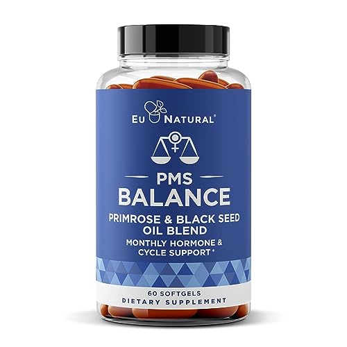 Balance PMS Vitamins for Women – Hormone Balance for Women, Menstrual & PMS Relief – Bloating, Cramping, Mood Swings, Restlessness, Clear Skin – Primrose Oil, Black Seed Oil & DIM – 60 Liquid Softgels