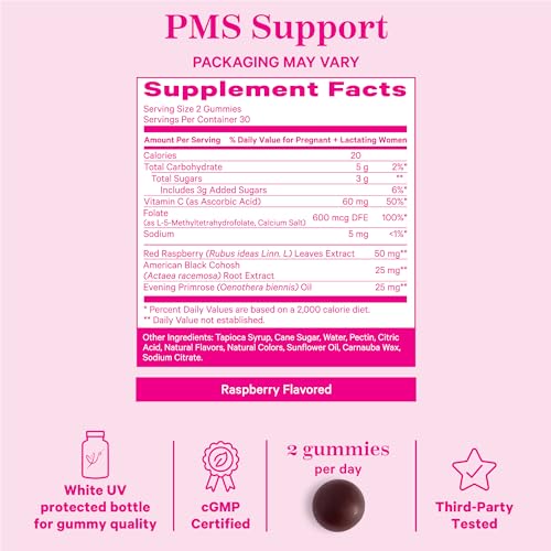 Pink Stork PMS Support Gummies – Red Raspberry Leaf & Black Cohosh for Bloating, Acne & Cravings – Proactive Period & PMS Support Supplement – Hormone Balance – 60 Plant-Based Berry Gummies